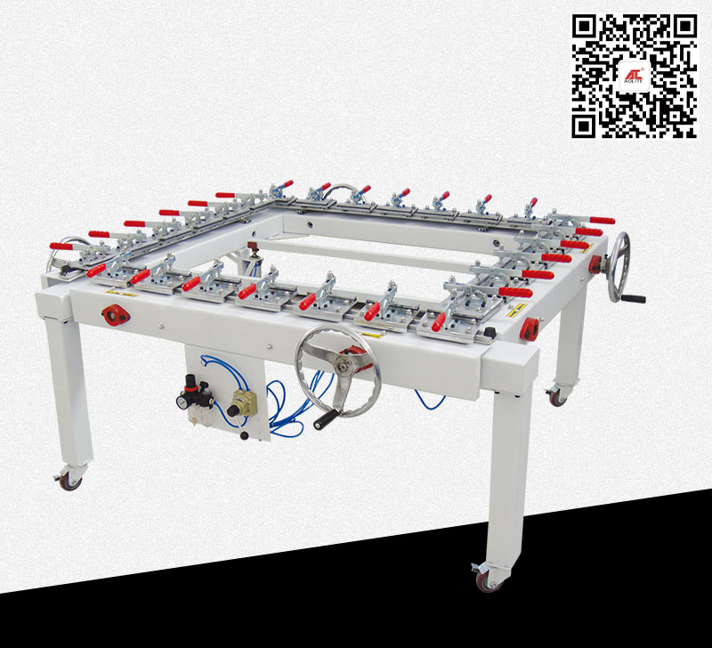 本產(chǎn)品采用手輪氣動收縮,網(wǎng)面平整絲網(wǎng)收力均勻,可以繃多個網(wǎng)框,工作效率快,適用于服裝印花圖案網(wǎng)板的制作。